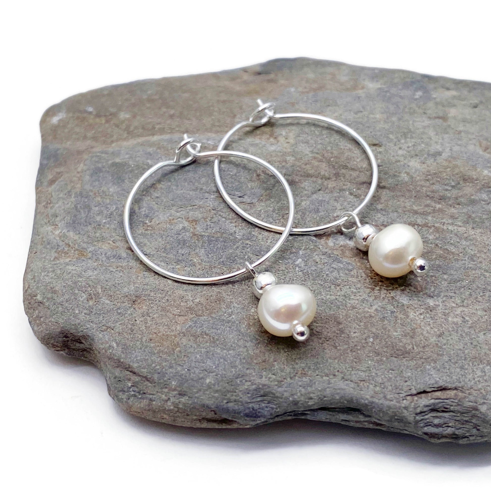 White Freshwater Pearl Bead Silver Tone Hoops : 20mm