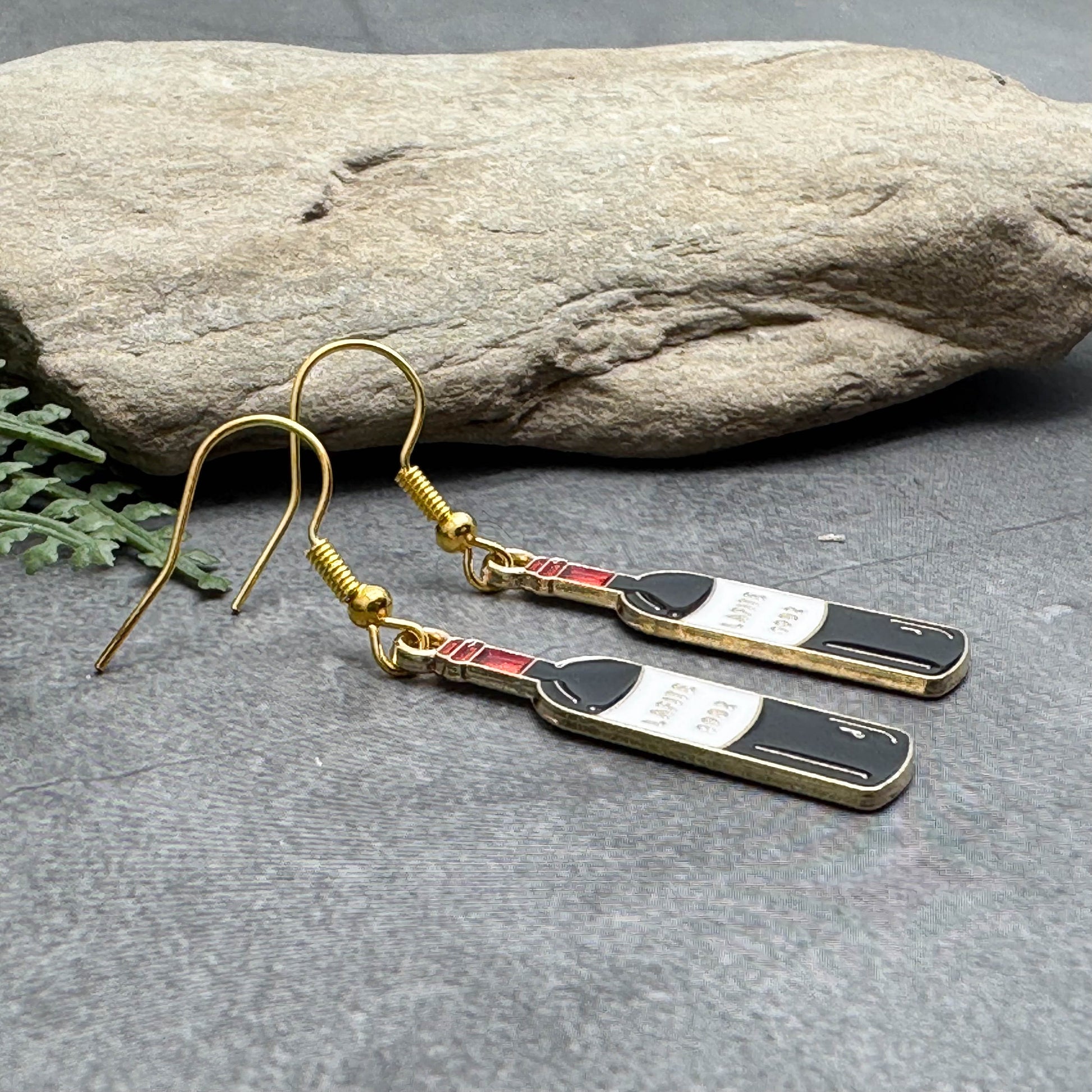 Gorgeous little charm bead earrings, in a wine bottle design with red and white enamel, mounted on gold tone hooks.