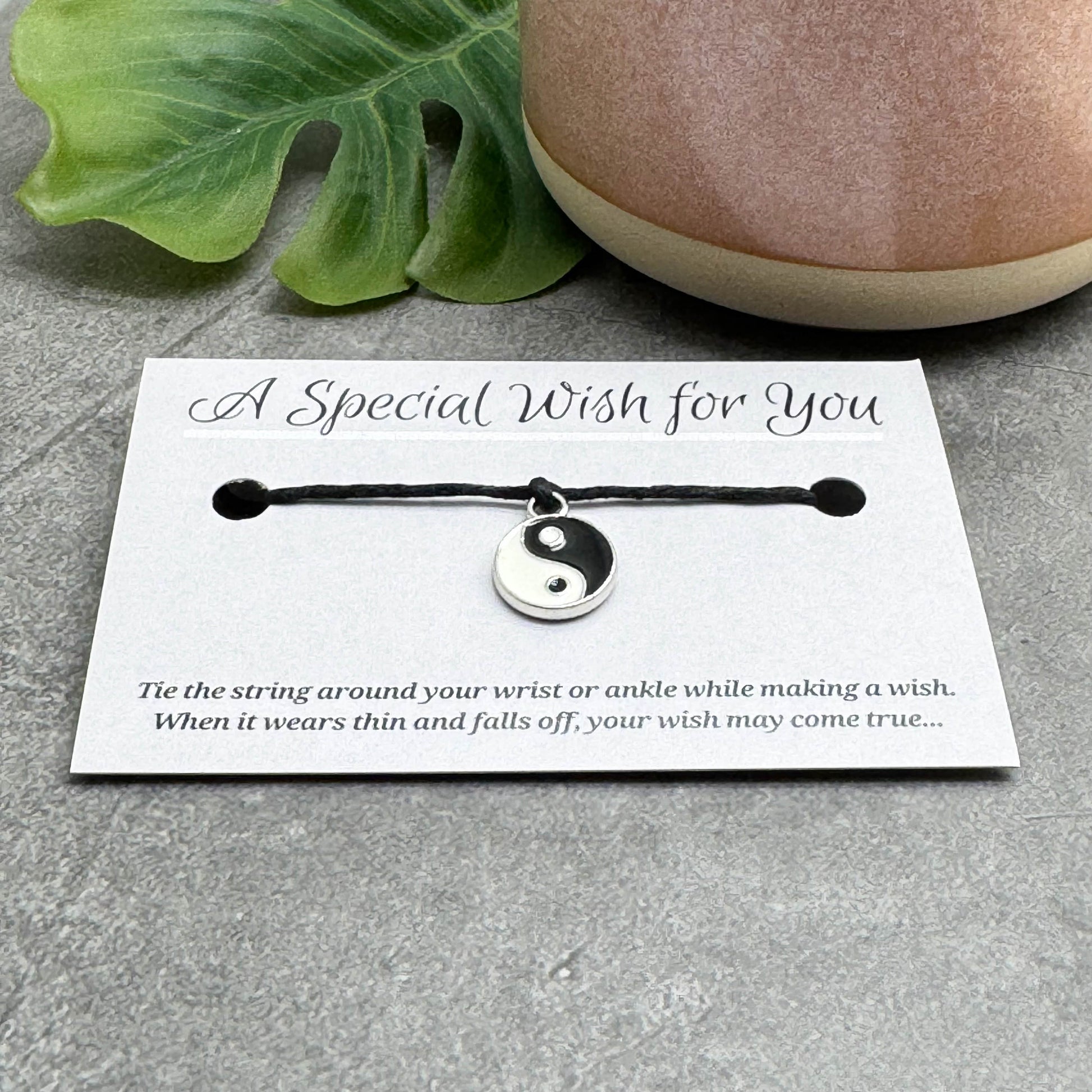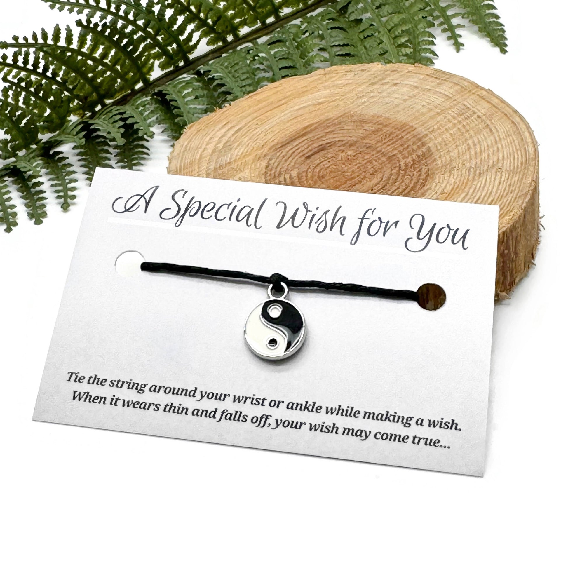 A slim hemp string bracelet with a small silver tone Yin Yang charm with black and white enamel. Comes presented on a printed card (business card sized).