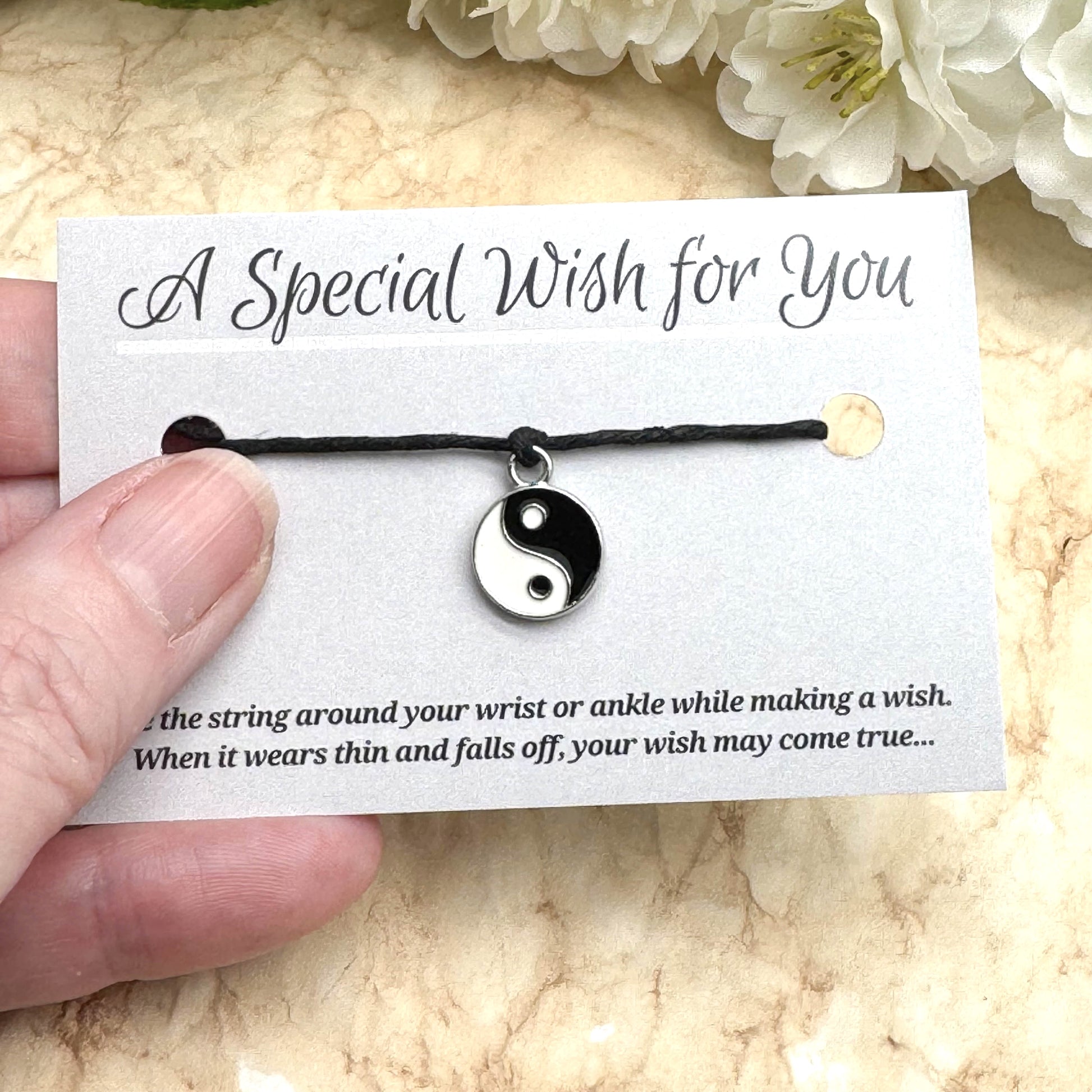 Tie the string to your wrist or ankle while making a special wish. When bracelet wears thin and falls off, your wish may come true...